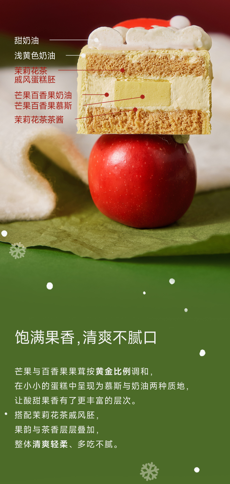 圣诞老人可爱的外表下,是茉莉花香的蛋糕与百香果芒果香味交织的丰富口感