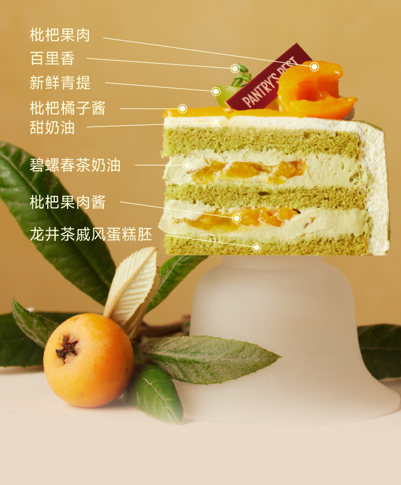 碧螺春奶油明亮的茶香奶油与枇杷的果粒夹心果香完美契合,带给你春日的绿色与盎然,一口咬春,唇齿间萦绕春茶枇杷香