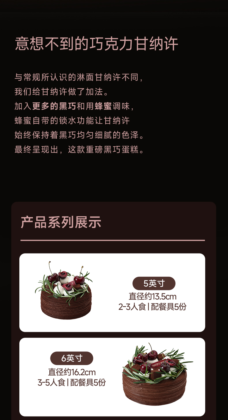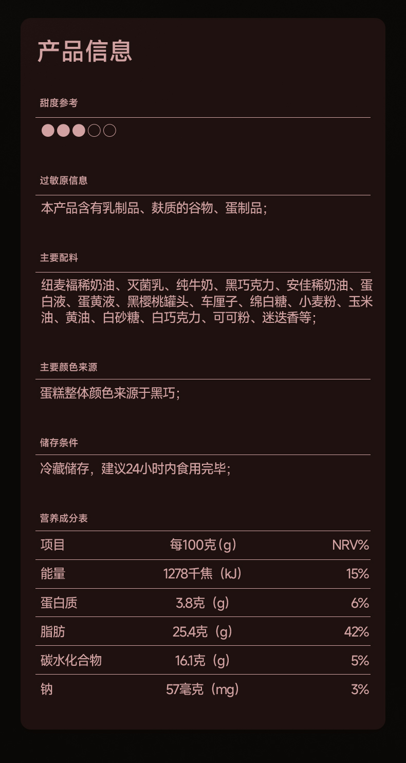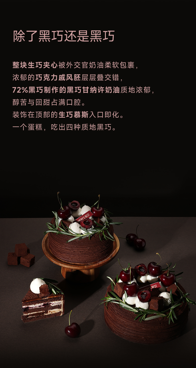 酸甜黑樱桃果酱,双重生巧克力与外交官奶油,搭配巧克力甘纳许和巧克力戚风胚,巧克力风味拉满