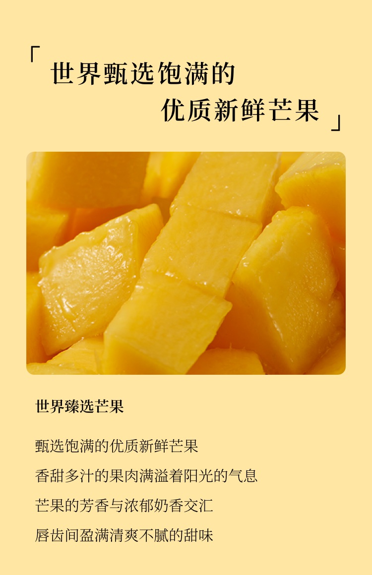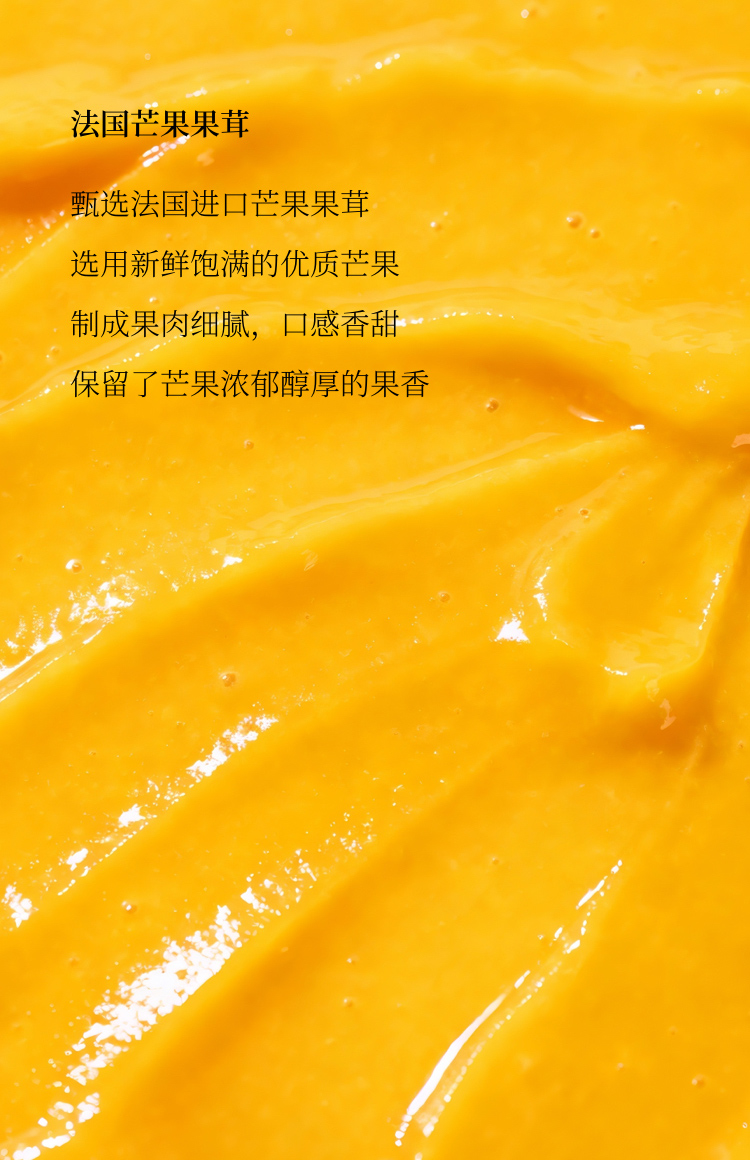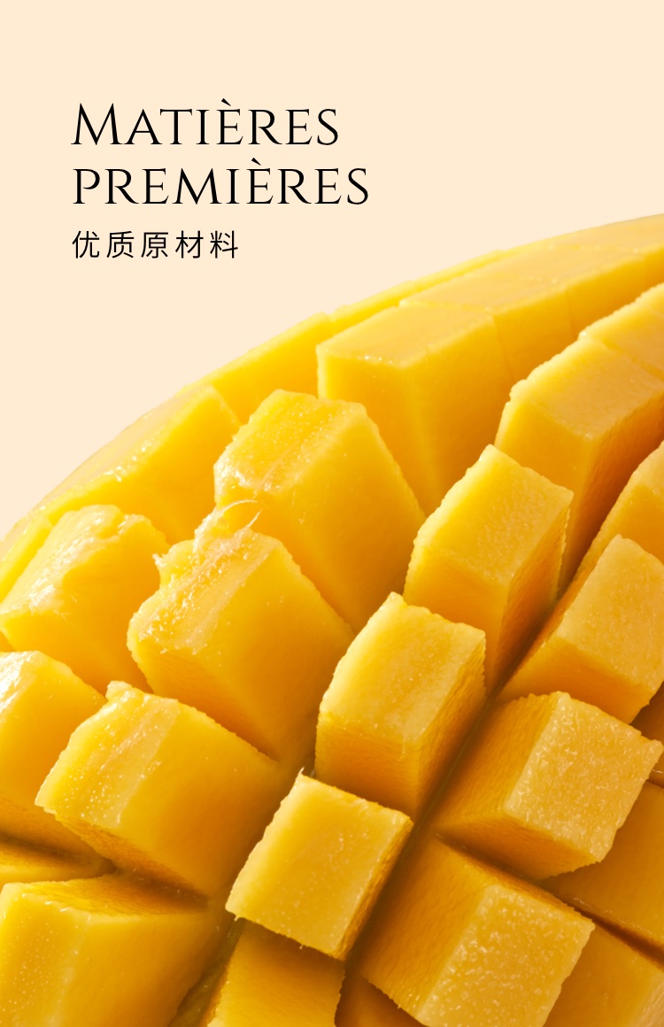用心甄选热带优质芒果, 芒果及百香果的完美组合,香气迷人,绽放清甜芳华。