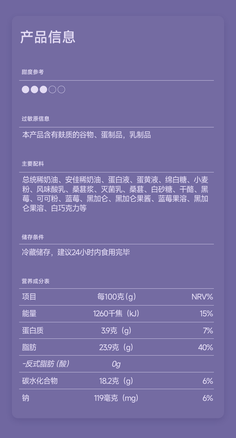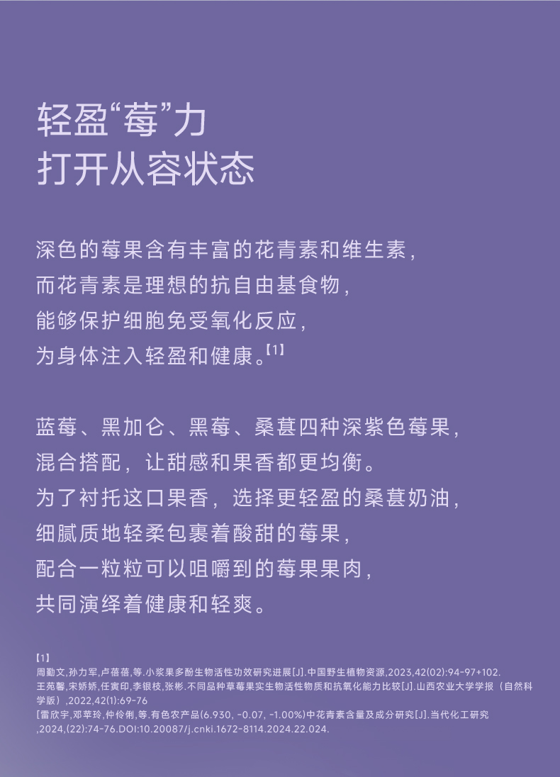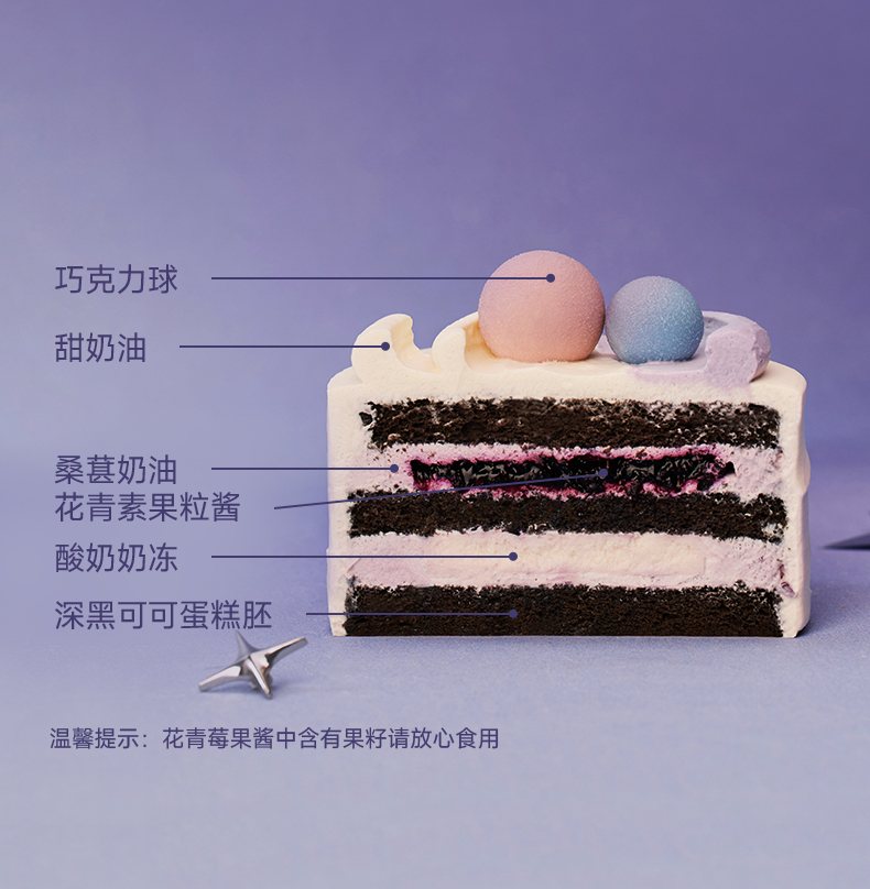 添加四种深紫色莓果,软绵的深黑可可戚风与桑葚奶油碰撞,果香四溢