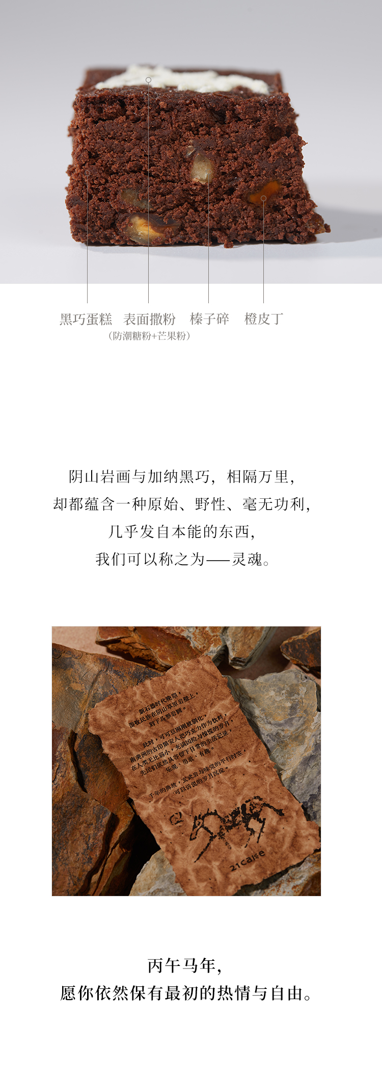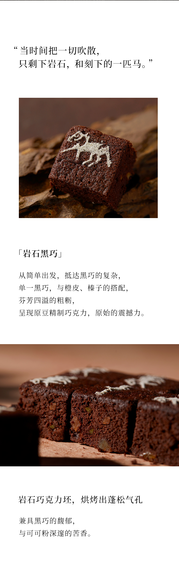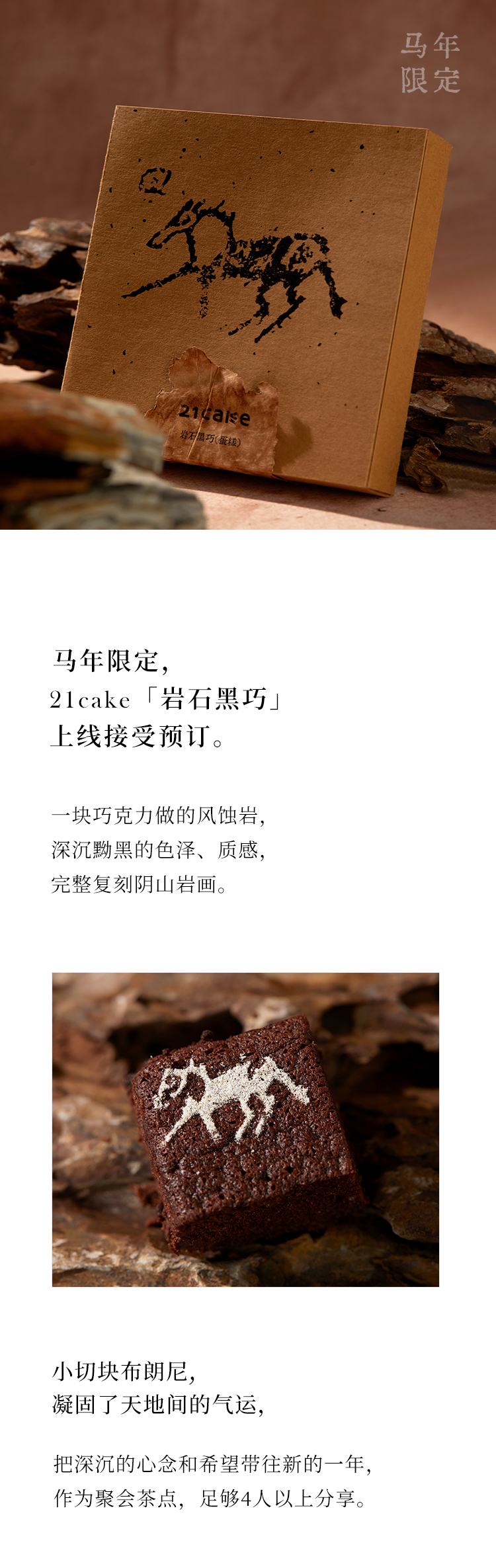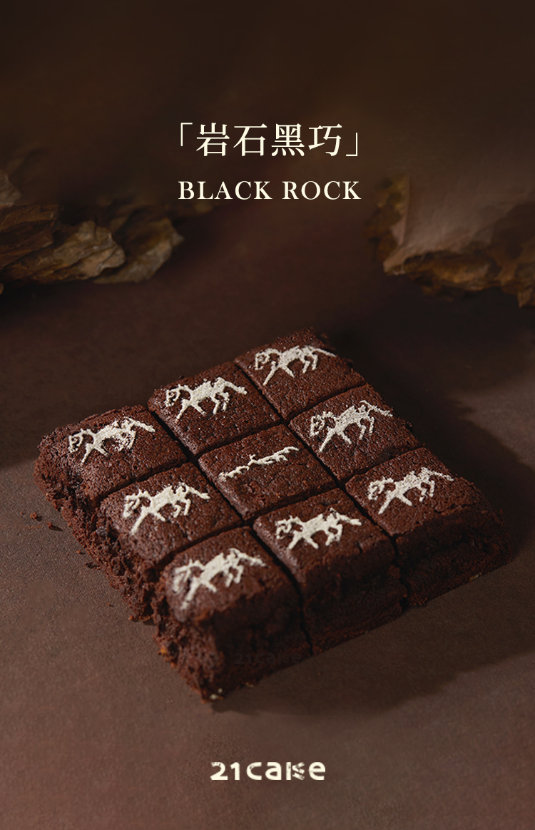 马年限定蛋糕,一块黑巧、榛子与橙皮做的风蚀岩,原始粗粝的质地,复刻阴山马形岩画。