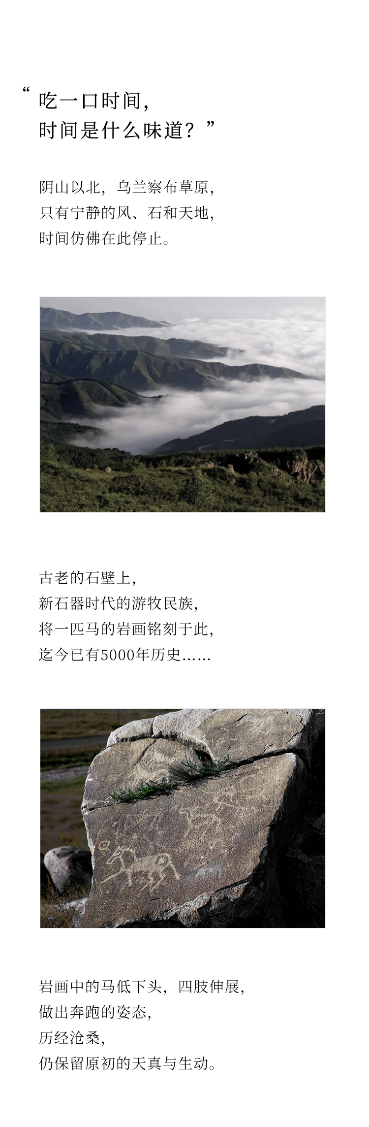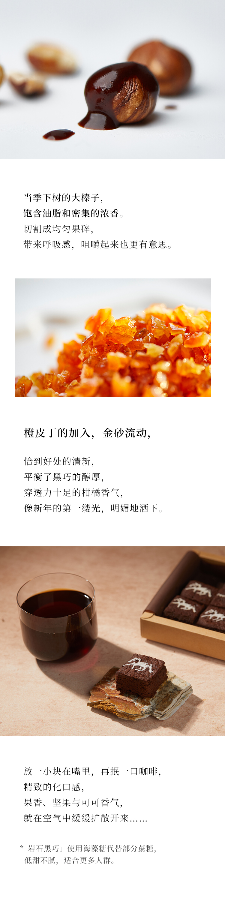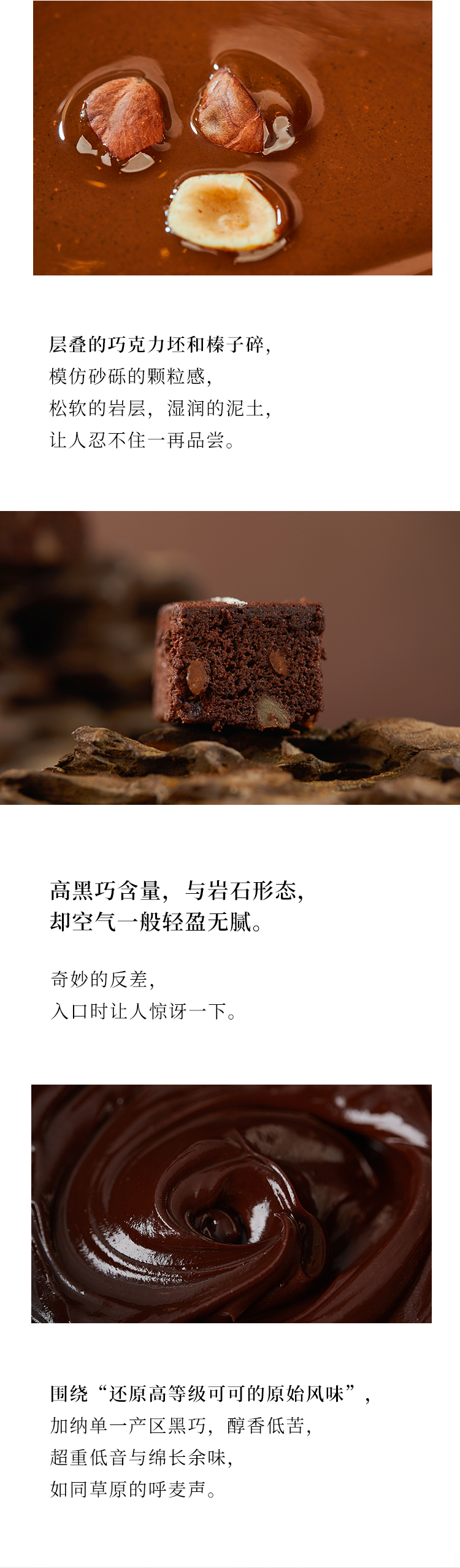 马年限定蛋糕,一块黑巧、榛子与橙皮做的风蚀岩,原始粗粝的质地,复刻阴山马形岩画。